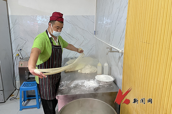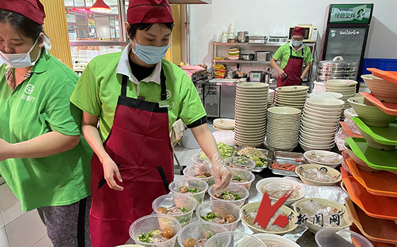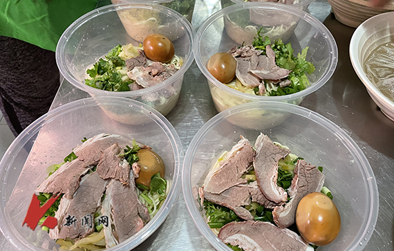 在餐厅后厨,记者看到,在拉面师傅娴熟地动作下,一份份有肉有蛋有菜、冒着热气、带着爱心的面条很快出锅,并以最快的速度送到新生手中。(记者 王卓/文摄)