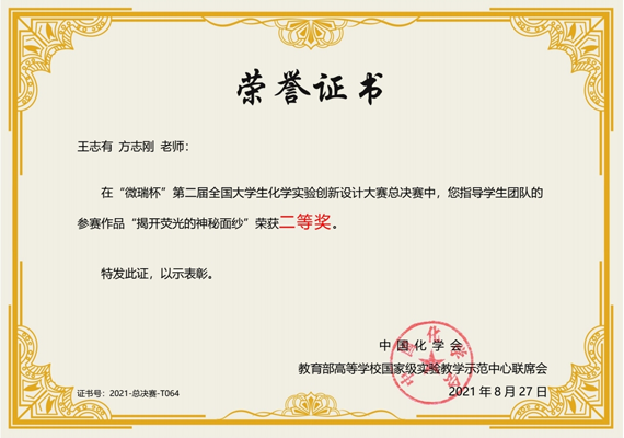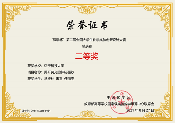 8月25日-27日,“微瑞杯”第二届全国大学生化学实验创新设计竞赛全国总决赛在青岛科技大学举行。乐竞·体育(中国)官方网站化学工程学院应用化学系马桂林、宋雪、任丽爽3人团队的科普实验作品“揭开荧光的神秘面纱”(指导老师:王志有、方志刚)获二等奖。