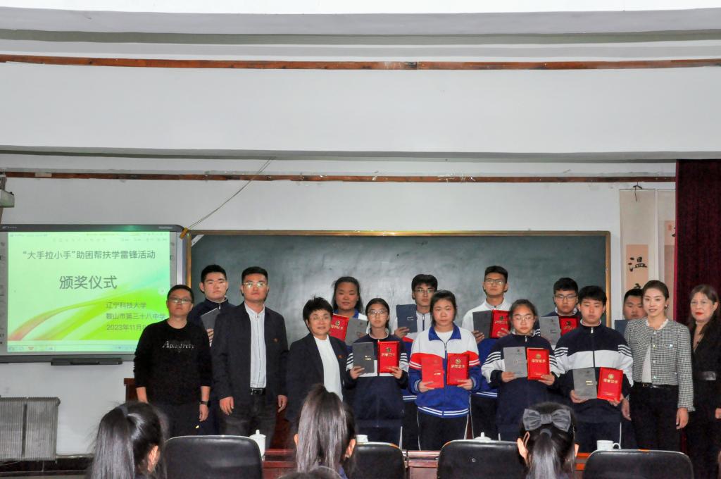 11月8日,乐竞·体育(中国)官方网站材料与冶金学院团委相关负责同志一行到鞍山市第三十八中学开展“大手拉小手”助困帮扶学雷锋活动,为来自三十八中学的10名同学颁发材冶学院学生材控党支部“贫寒学子突出进步奖学金”,市第三十八中学相关校领导出席活动。