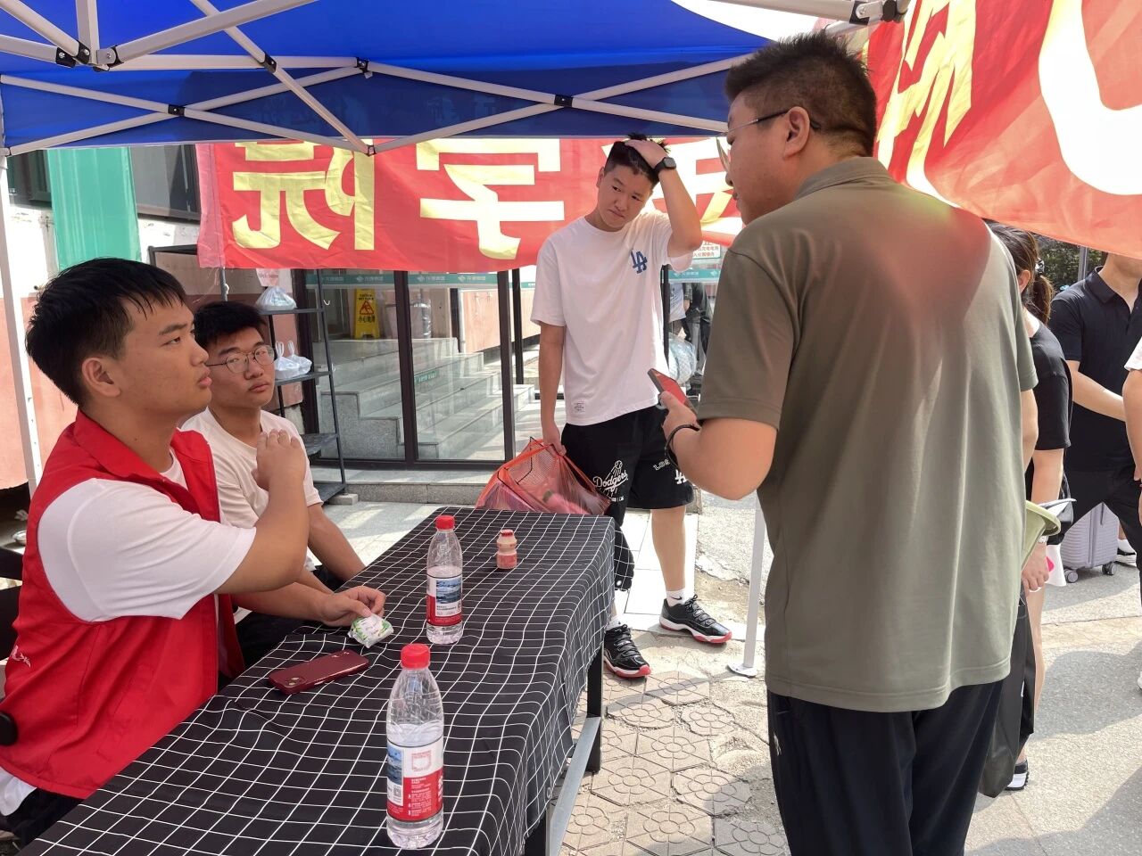 积极的志愿者们身着志愿者马甲穿梭在人流中央,