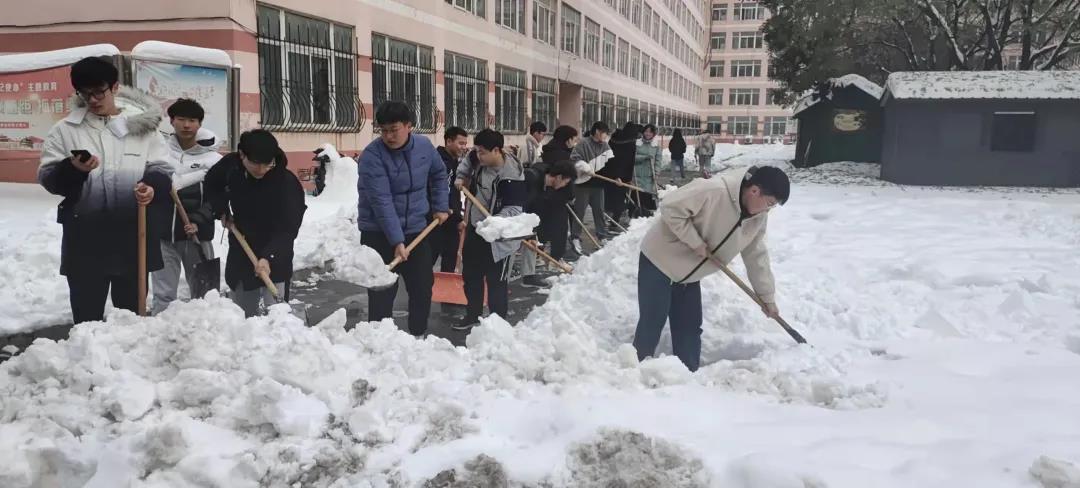 志愿者们分工明确,合作默契,纷纷带着铁锹、扫帚、桶等工具,根据区域划分安排,进行扫雪除冰工作。在寒冷的环境中,大家你推我铲,团结协作、不畏严寒,有序地清理公寓路面和体育场内的积雪。他们有的挥舞铁锹,铲冰除雪,一铲一铲堆到道路两边;有的手拿扫帚,清扫路面,经过三个多小时的奋力清扫,一点点地将积雪和冰层清除并集中堆放,负责区域的积雪情况得到缓解,圆满地完成了扫雪任务,及时保证了师生的出行安全,为大家的生活与安全出行带来了便捷。