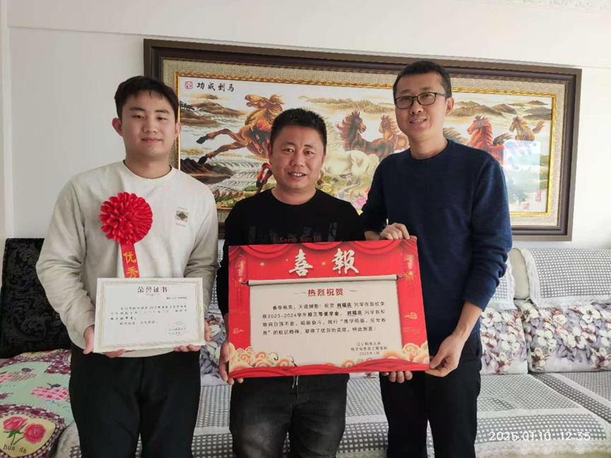 “看到孩子的成长和进步,我们同家长一样振奋、开心。遇到的困难都是暂时的,学校和学院会尽全力支持孩子顺利完成学业。相信他能学好本领回馈社会、回报家庭,实现自我价值。”在朝阳县二十家子镇通信工程专业2022级学生王天昊家中,于老师亲手将喜报和国家励志奖学金证书交到学生和家长的手中,并不断鼓励获得荣誉的学生。朝阳县二十家子镇2024年夏天遭受大洪水,王天昊家的房屋和庄稼受损严重,家庭经济损失巨大。王天昊同学自强不息,学习勤奋刻苦,获得国家励志奖学金。“没想到孩子在学校表现得这么优秀!能取得国家级奖学金这么好的成绩,这都离不开院领导、老师的悉心培养。孩子交给你们,我们非常放心!”王天昊的父母由衷感言。