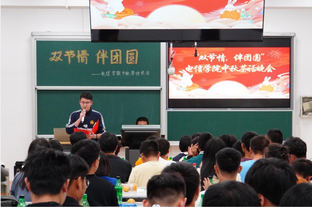 929日,时值中秋佳节,电信学院在博闻楼一合举办双节情 伴团圆中秋茶话晚会,晚会由团学骨干佟其聪主持,学院学办主任孙倩、研究生老师施春妮、2023级留校新生共计100人次参加活动。