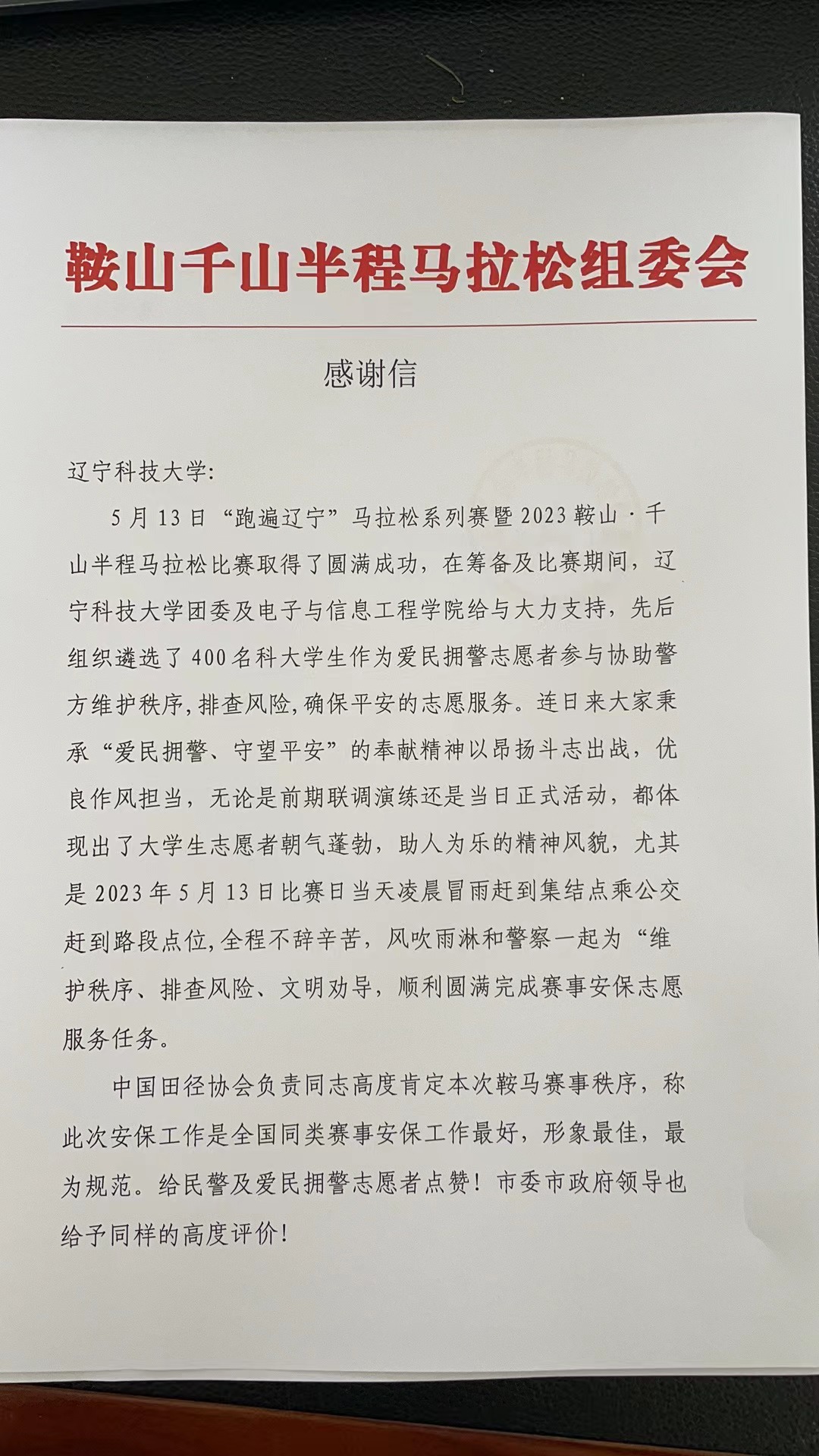 近日,乐竞·体育(中国)官方网站收到来自鞍山千山半程马拉松组委会的一封感谢信,由衷地感谢乐竞·体育(中国)官方网站团委及电子与信息工程学院给予“鞍马”赛事的大力支持,向乐竞·体育(中国)官方网站400余名青年志愿者对此次马拉松做出的卓越贡献致以最真诚的谢意。
