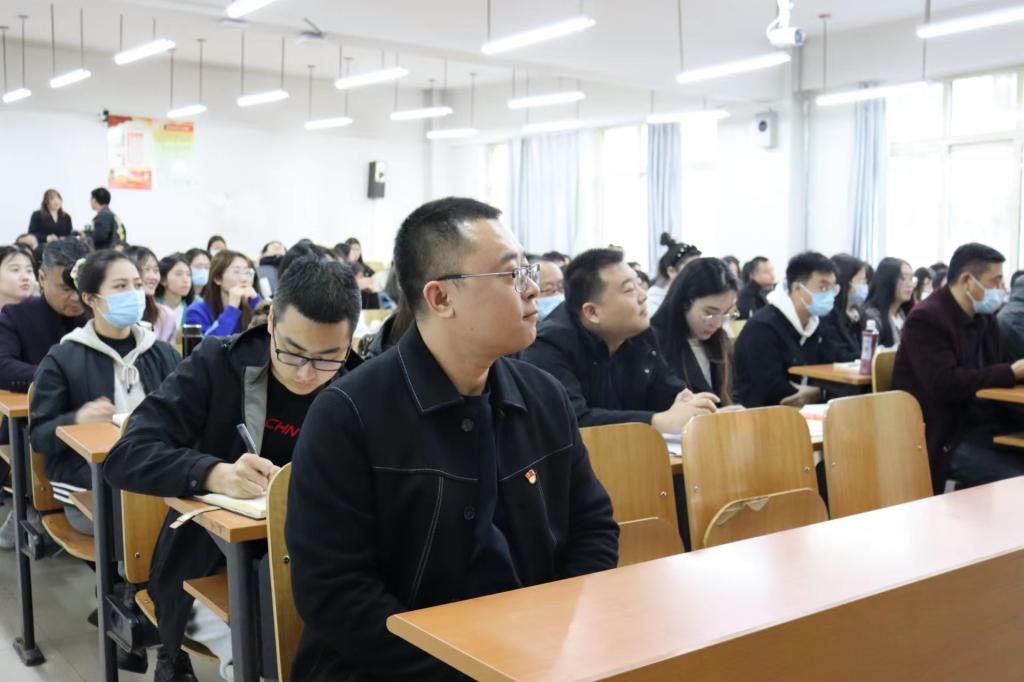 会议邀请经济与法律学院副院长温馨作题为《汇聚奋斗的共识与力量,切实推进高质量发展》的专题宣讲报告。温馨说,要汇聚共识、凝聚力量、推进发展,首先就要达成共识、理清脉络、明确任务。温馨为大家详细介绍了新时代新征程的历史沿革,深刻阐明了“新征程”的中心任务、总的战略安排以及未来五年的主要目标任务之间的层层关系,并引用习近平总书记在中共中央政治局组织生活会上的讲话,为大家阐明如何在开展工作中实现量变与质变的飞跃,深入推进高质量发展。