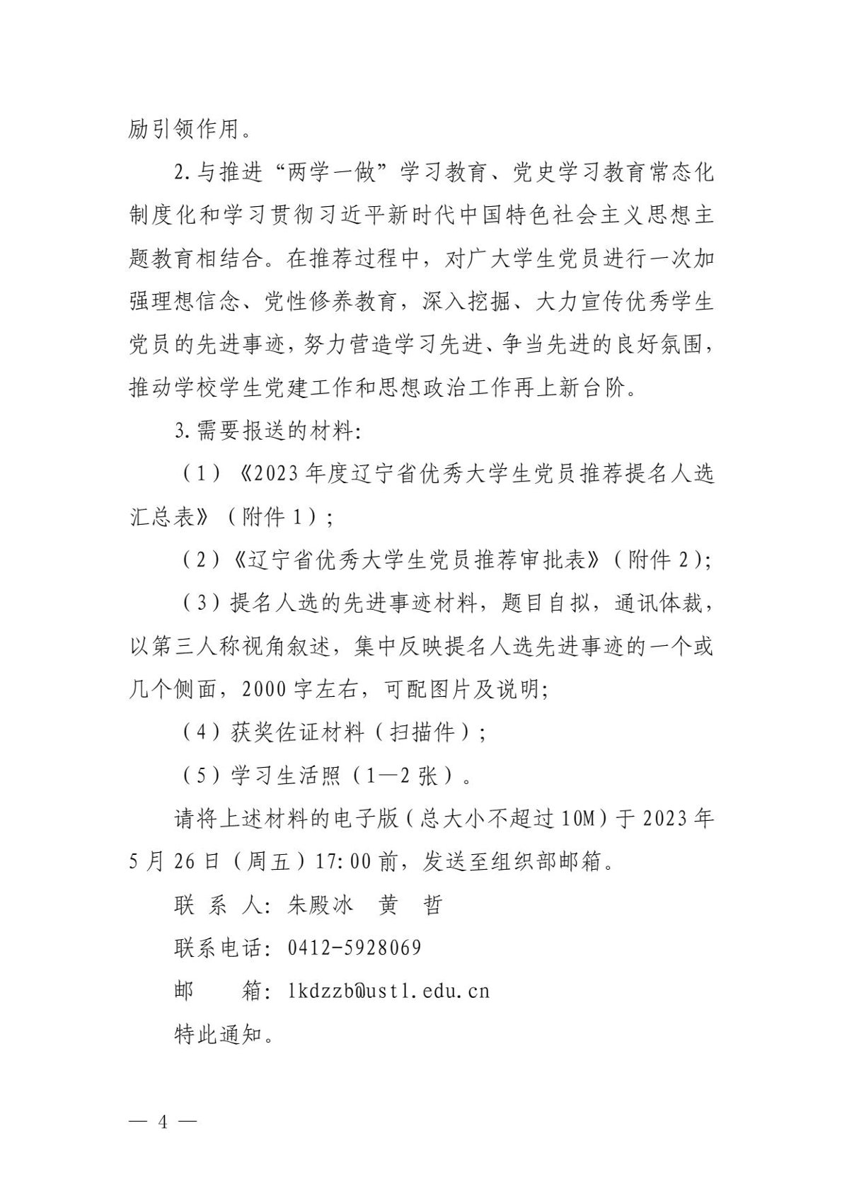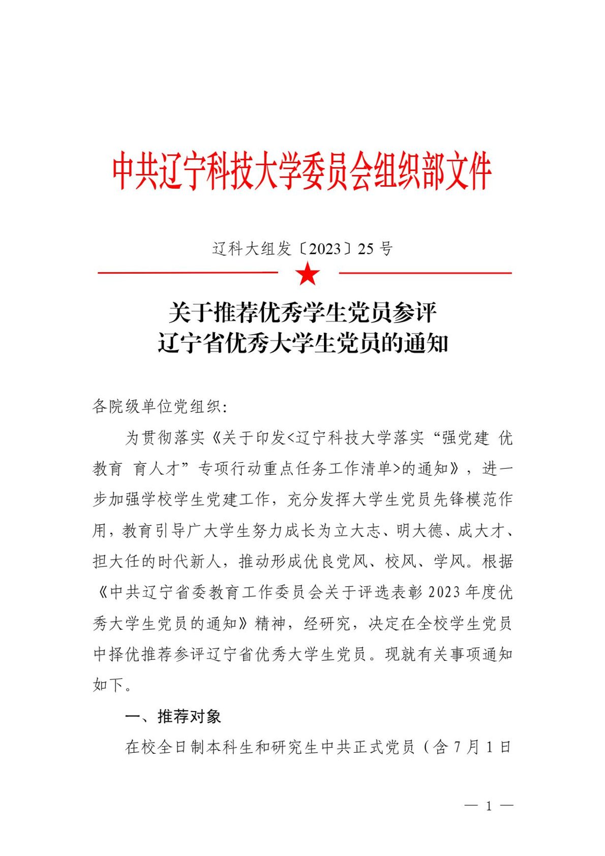 关于推荐优秀学生党员参评辽宁省优秀大学生党员的通知