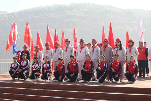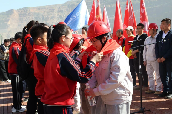 8时20分,队伍抵达观景台,致敬劳动者的仪式庄严开启。小学生代表为矿工佩戴红领巾,童声清澈,敬意真挚;“暖风”爱心团队学生代表献上洗漱用品,以点滴心意传递对劳动者的礼赞。随后,郭明义深情讲述矿山建设者的奋斗故事,带领众人重温激情岁月;大学生宣讲团成员吕小文以激昂宣讲《做一个追光的人》,用青春的声音传递信仰的力量;中学生代表王韬杰和黄爱茹同学饱含深情的诵读《致敬齐大山矿工》来礼赞齐大山的壮美华章;小学生代表王哲莫轩和简铭萱同学以《劳动者赞歌》来颂扬最美劳动者。少年们嗓音稚嫩,却字字坚定,将强国志、报国行的种子,深深播撒在每个人心中。在郭明义的指挥下,全体人员齐声高唱《歌唱祖国》,嘹亮歌声响彻矿山。