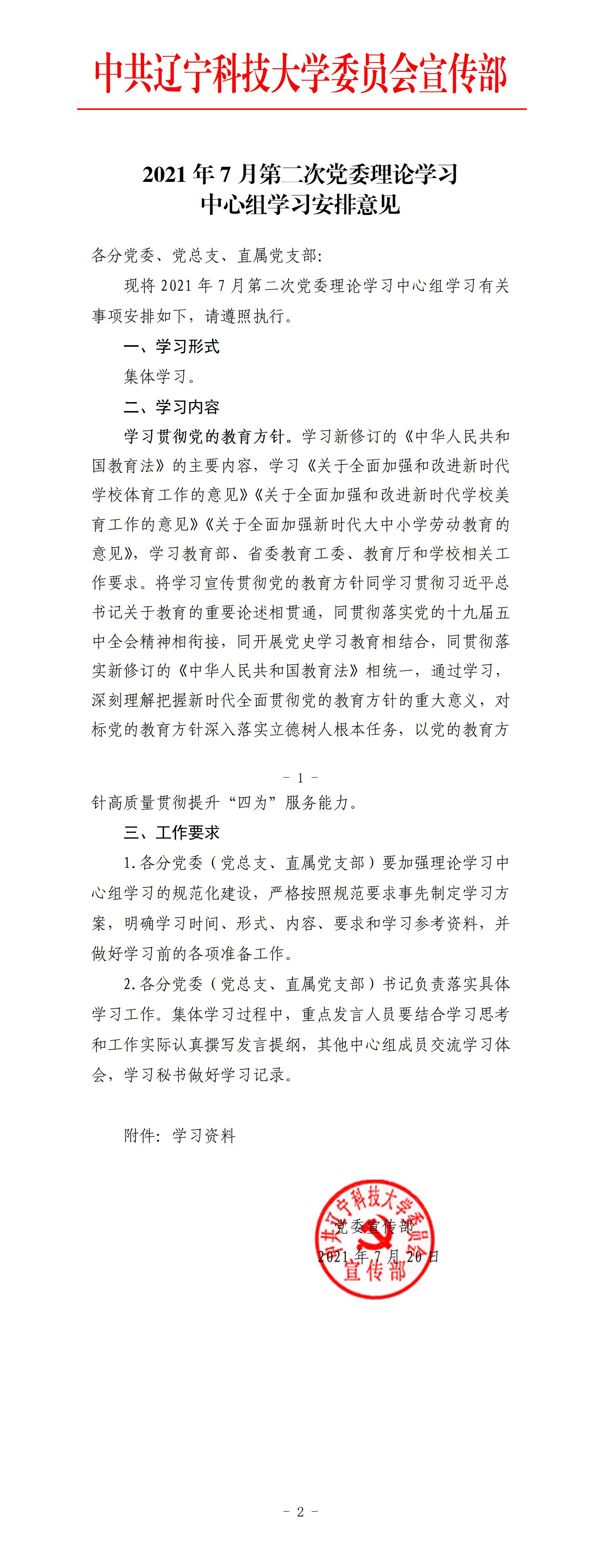 2021年7月第二次党委理论学习中心组学习安排意见