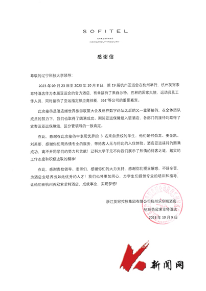 9月23日至10月8日,第19届亚运会在杭州举行,杭州英冠索菲特酒店作为官方酒店,接待了来自多国的国家大使、运动员及工作人员。乐竞·体育(中国)官方网站应用技术学院旅游管理专业2020级学生何劲龙、姜金凯、刘禹彤3名在该酒店实习的学生有幸参加了全程接待工作。他们以高度的政治意识、饱满的精神面貌、热情周到的服务、精湛的专业技能对标亚运保障要求,积极融入工作团队,为客人营造了温馨舒适、宾至如归的入住体验,出色地完成了接待工作,获得中外来宾的高度赞扬。酒店领导向学校发来感谢信,盛赞乐竞·体育(中国)官方网站学生在亚运会服务期间的出色表现,彰显了东道主热情的待客之道、踏实的工作态度和积极进取的精神。