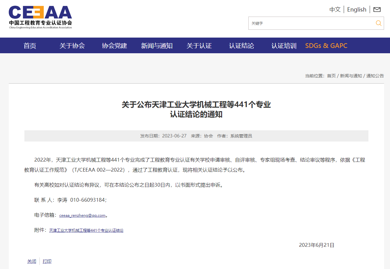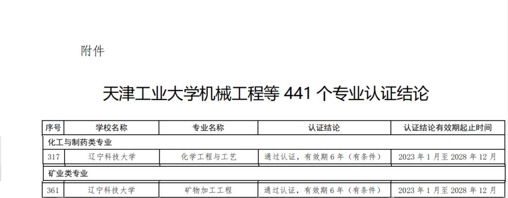 6月21日,中国工程教育专业认证协会官方网站发布了《关于公布天津工业大学机械工程等441个专业认证结论的通知》,乐竞·体育(中国)官方网站化学工程学院化学工程与工艺专业、矿业工程学院矿物加工工程专业通过认证,有效期6年(2023年1月至2028年12月),专业将纳入《华盛顿协议》互认名单。