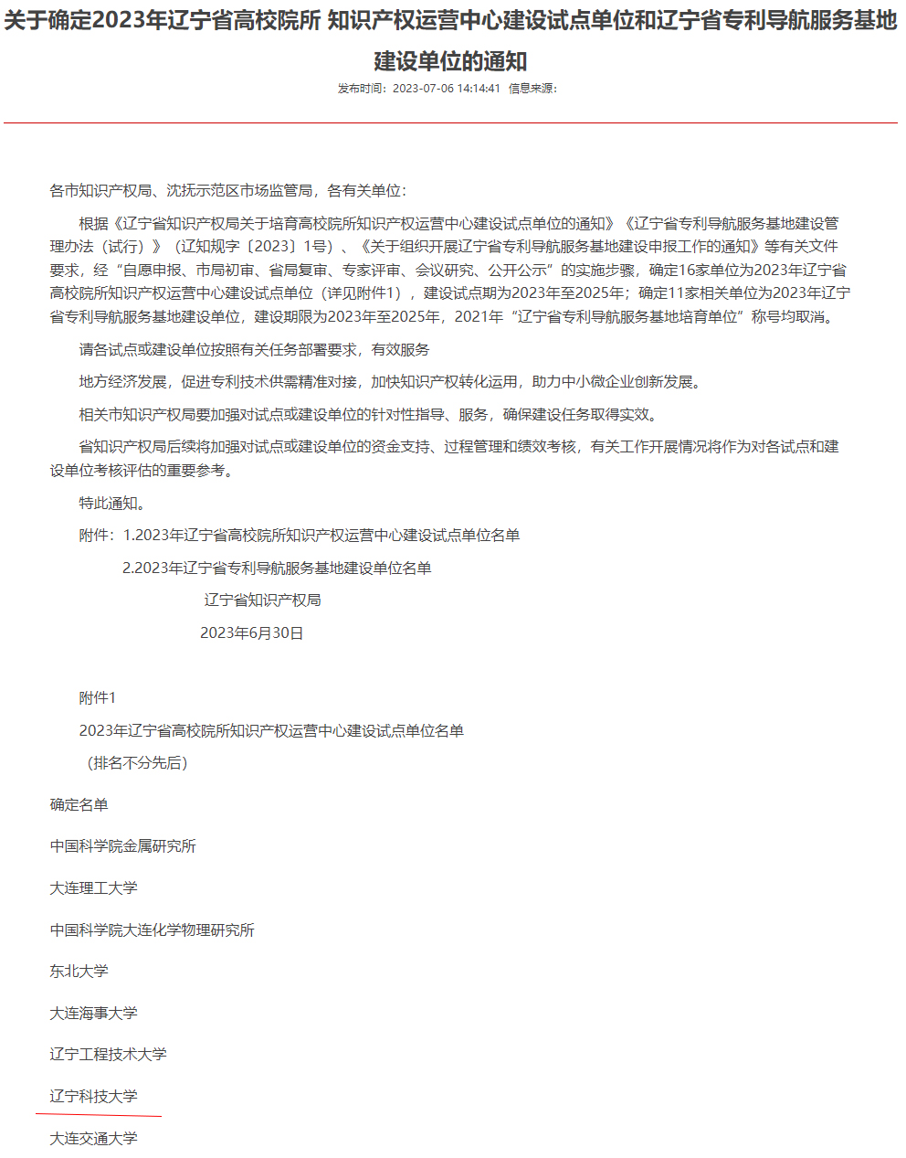 近日,辽宁省知识产权局公布了首批辽宁省高校院所知识产权运营中心建设试点单位,乐竞·体育(中国)官方网站成功获得批定。