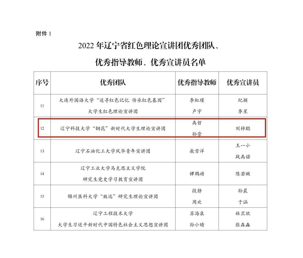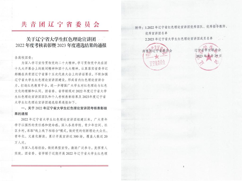 近日,共青团辽宁省委员会、辽宁省学生联合会联合通报2022年辽宁省大学生红色理论宣讲团考核表彰结果,乐竞·体育(中国)官方网站“钢花”新时代大学生理论宣讲团获评2022年辽宁省大学生红色理论宣讲团优秀团队。宣讲团负责人刘梓聪获评“优秀宣讲员”荣誉称号。