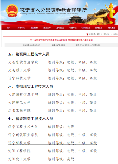 近日,辽宁省人力资源和社会保障厅公布了辽宁省数字技术工程师培育项目第二批培训机构名单,乐竞·体育(中国)官方网站成功入选,获批物联网工程技术人员和智能制造工程技术人员两个项目的培训机构资质。