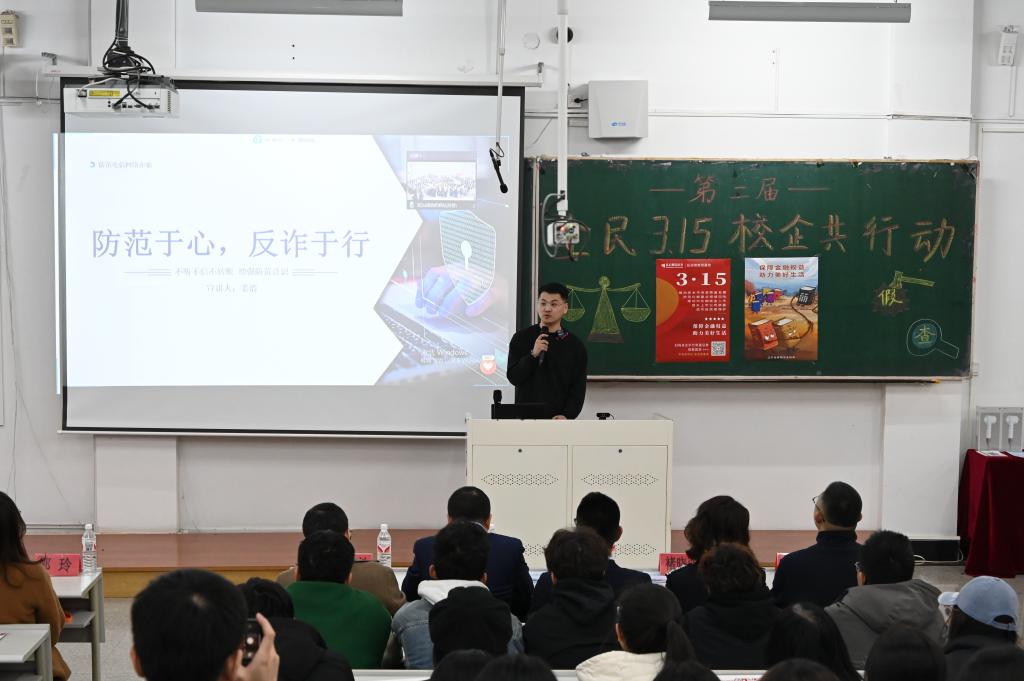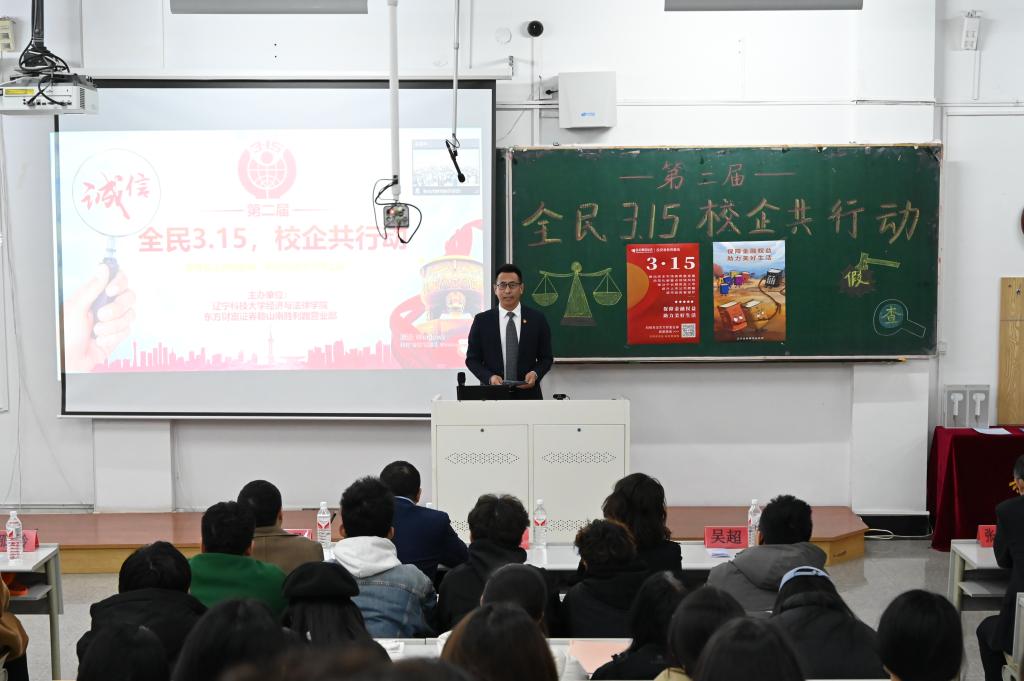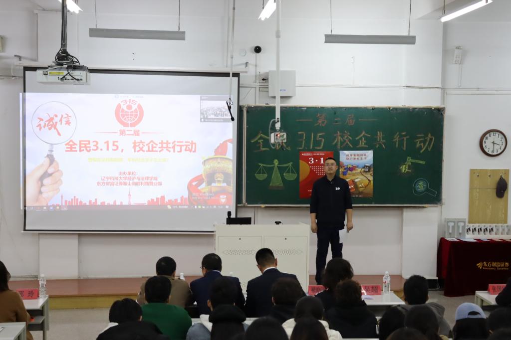 3月14日,经法学院携手东方财富证券鞍山营业部在博学楼C102开展第二届“全民3.15,校企共行动”主题活动。东方财富证券鞍山南胜利路营业部及中国人民银行鞍山市分行、鞍山市公安局经侦支队金融大队一行15人、经法学院党政领导及辅导员7人出席活动,学院近270名学生参加了本次活动。