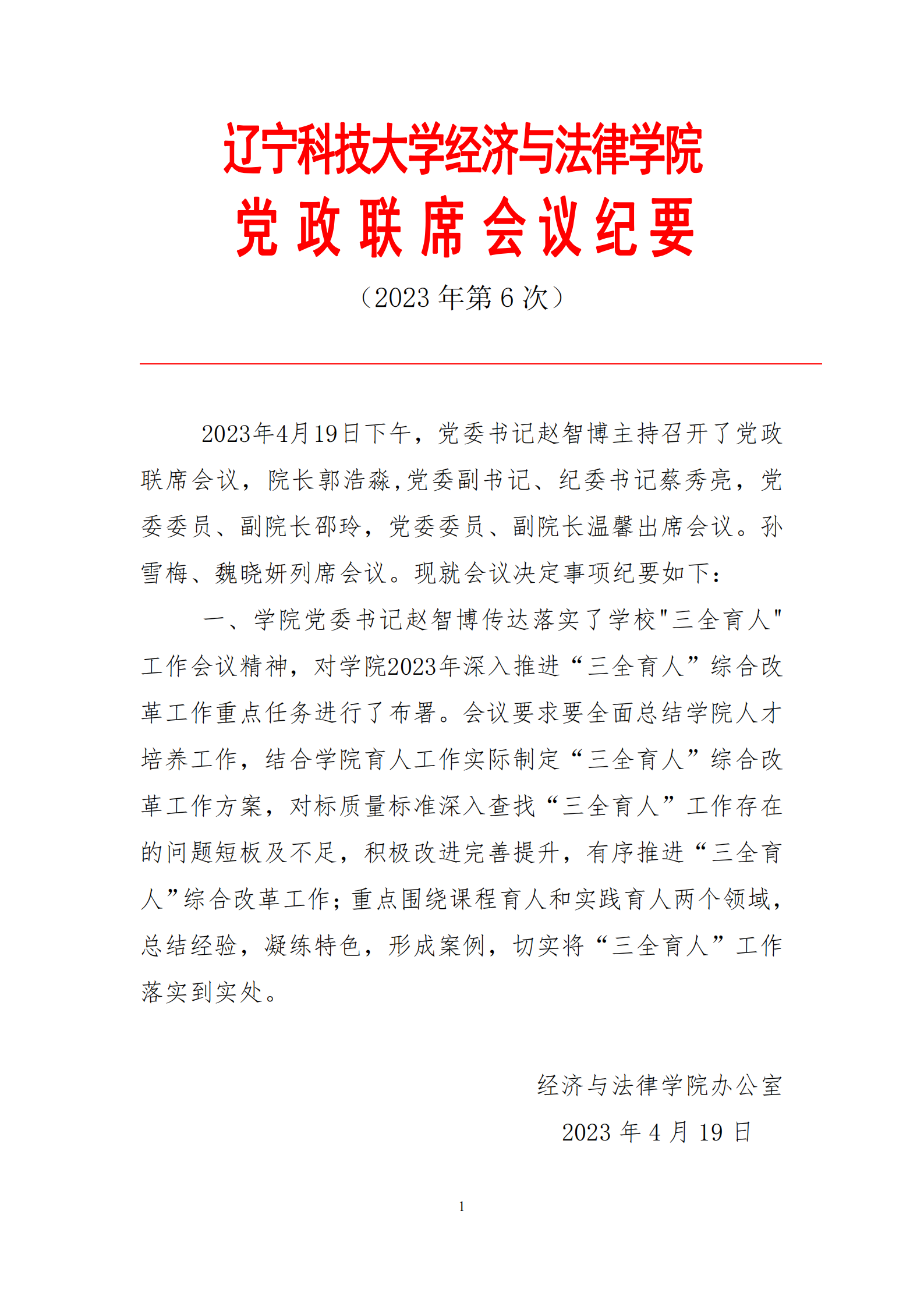 乐竞·体育(中国)官方网站经济与法律学院党政联席会会议纪要(2023年第6次)