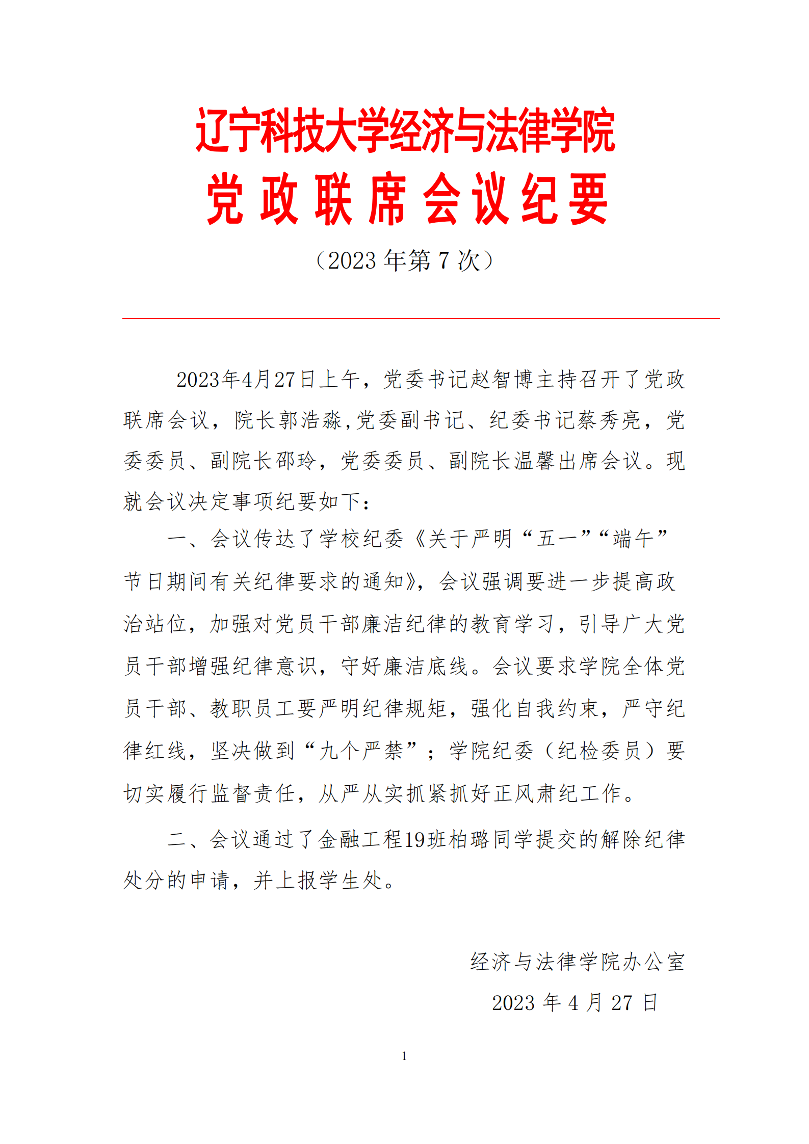 乐竞·体育(中国)官方网站经济与法律学院党政联席会会议纪要(2023年第7次)