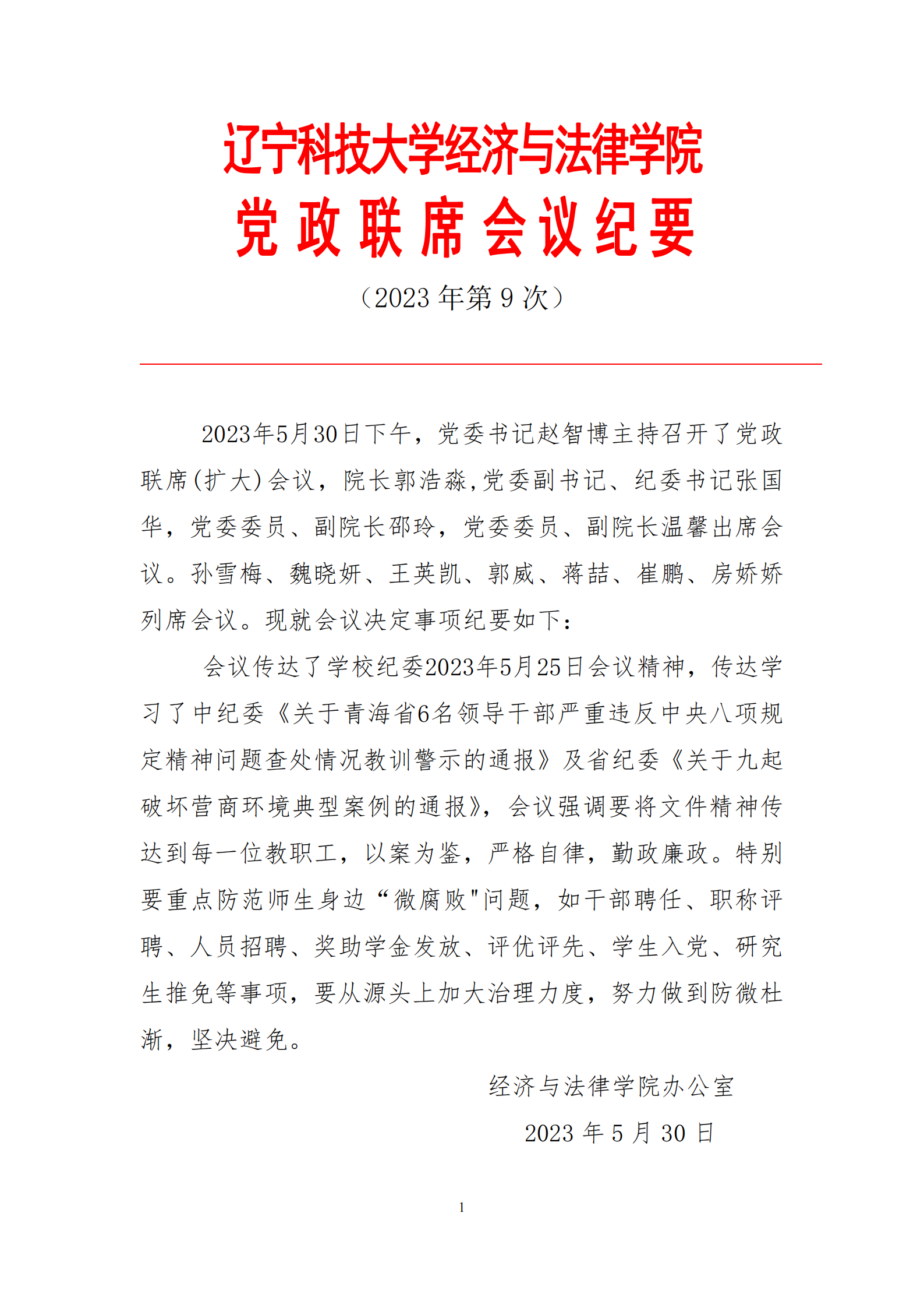 乐竞·体育(中国)官方网站经济与法律学院党政联席会议纪要(2023年第9次)