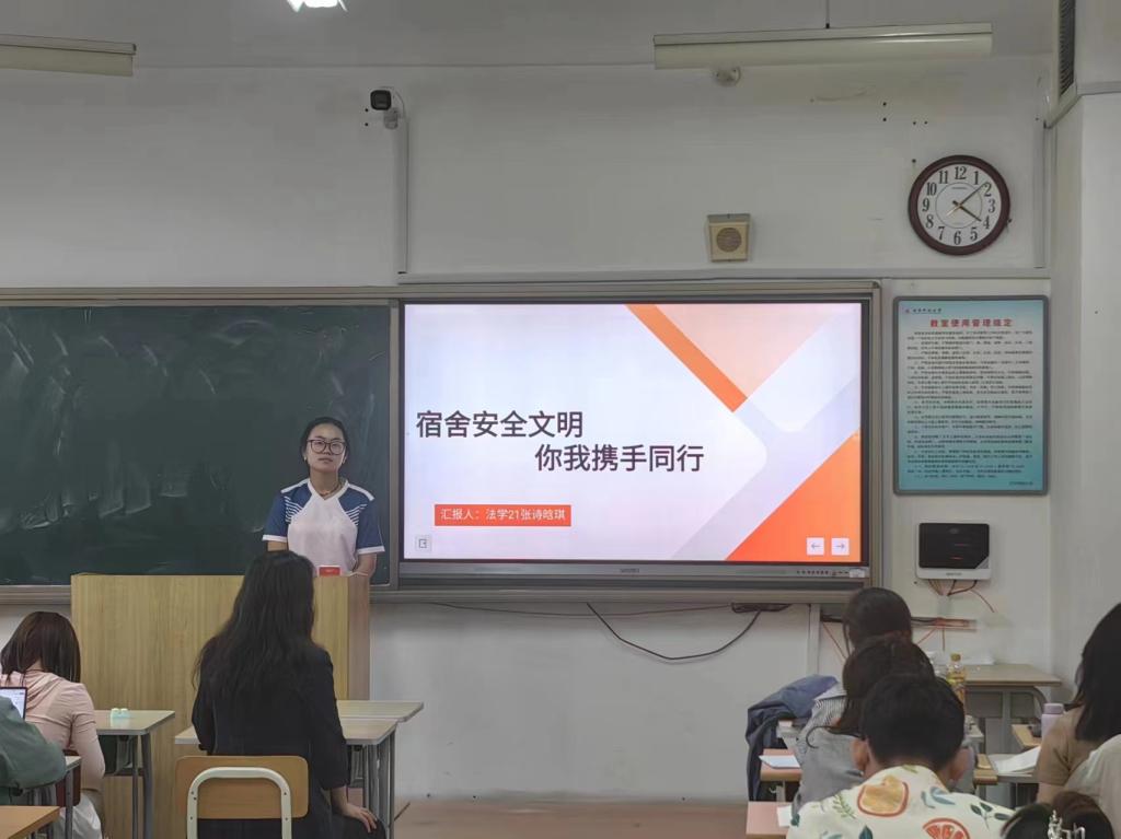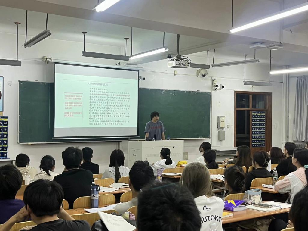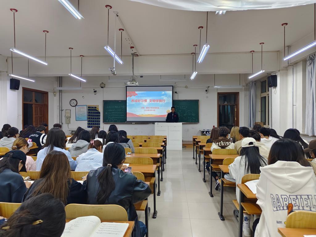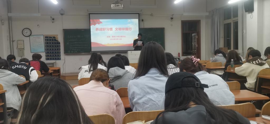 辅导员以“文明伴我行”为主题,通过列举校园不文明寝室案例和分析学生在个人寝室卫生、寝室文化氛围等方面存在的问题来让学生更好地了解寝室卫生环境和寝室文化氛围对大学生身心发展的重要影响,并通过列举“‘经法男人帮’,相呼共奋进”的例子来引导学生提高文明素养,与寝室同学在学习和生活中相互激励、共同进步。最后,辅导员表示,希望同学们在细节处约束自身行为,用实际行动践行文明行为,在规范中创造价值,争做新时代文明大学生。