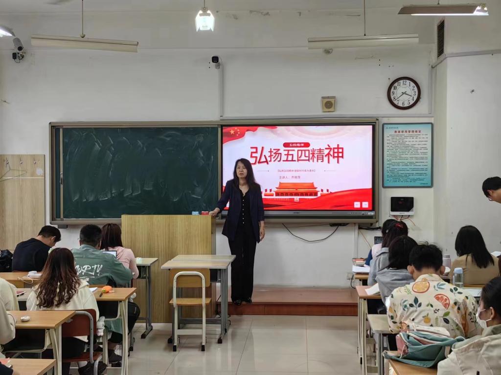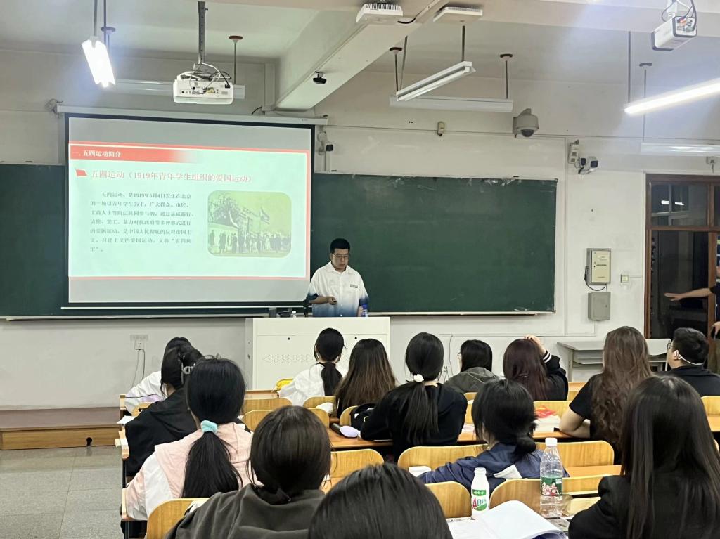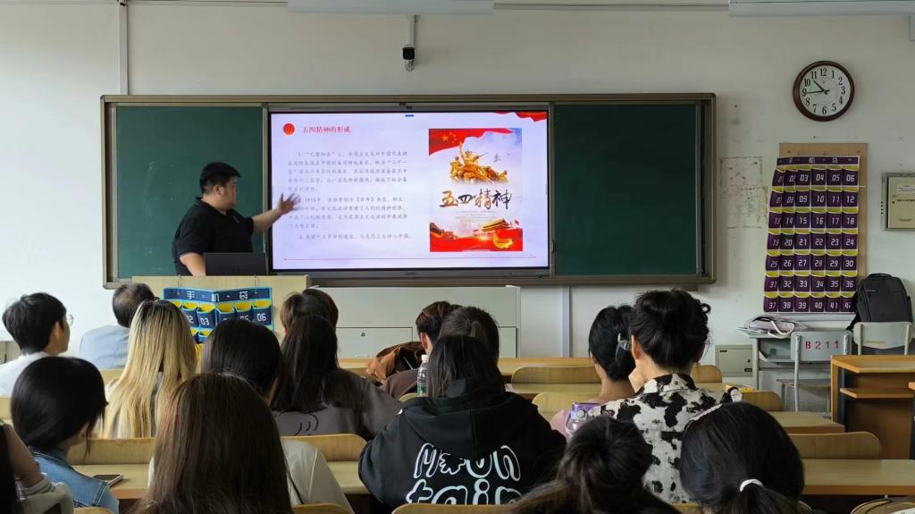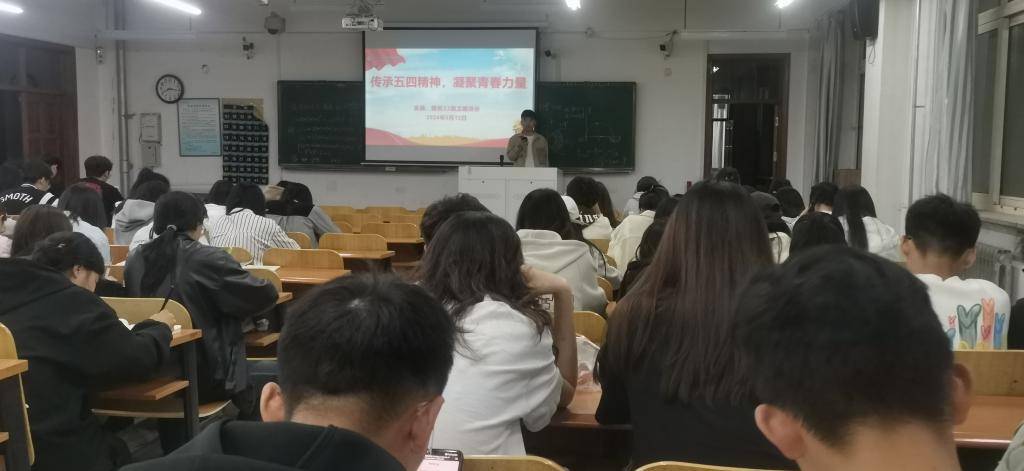 会上,辅导员以“传承五四精神 凝聚青春力量”为主题,从“五四运动”的历史背景及意义讲起,带领学生共同回望历史,在一段段感人的故事中、在一份份炙热的情感中了解“五四运动”的发展历程,感悟革命先辈的初心使命和家国情怀。辅导员以各行各业的当代杰出青年为例来向同学们深入讲解五四精神的内涵、五四精神的当代体现以及如何传承五四精神等方面的内容,并带领学生学习习近平总书记对青年的寄语,引导学生不辜负总书记的殷切期盼,大力弘扬和践行五四精神,以奋斗姿态激扬青春,坚定信念、敏于求知,把个人的理想追求融入党和国家事业中去,不负韶华、不负时代、不负人民。