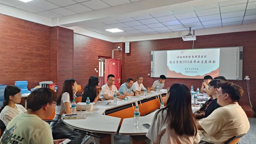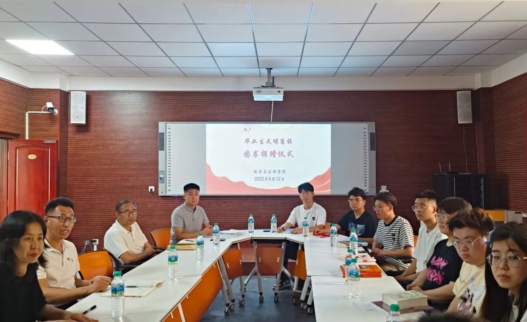 6月12日下午,经法学院于博识楼A407召开2023届毕业生座谈会暨图书捐赠仪式。经法学院党委书记赵智博、院长郭浩淼、党委副书记张国华、学办主任齐艳萍、团委副书记张鹏飞以及2023届毕业生代表出席本次活动。