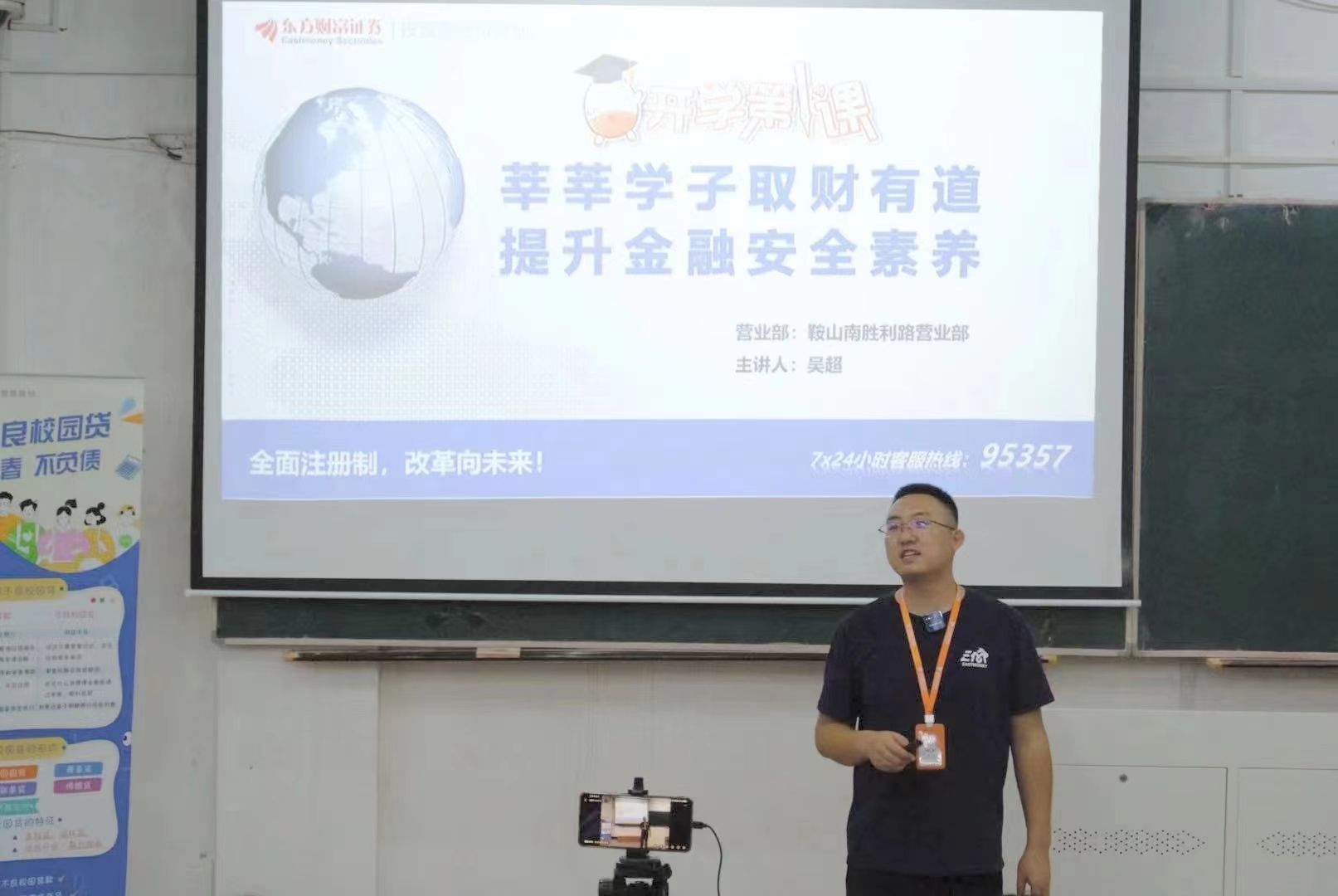 会上,东方财富证券鞍山营业部吴超通过理论与现实相结合方式,向同学们介绍了金融行业的前景和发展方向,他指出金融行业的本质是特许经营行业,拥有严格的准入制度,持续经营已成为金融行业的基本准则,并引导学生提升金融素养,弘扬金融正能量。随后,他以电影《孤注一掷》为引入点,帮助同学们了解校园贷、洗钱、非法集资、电信诈骗等,引导同学们警惕不良校园贷,警惕洗钱陷阱。