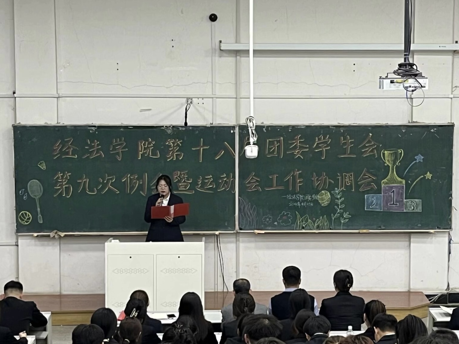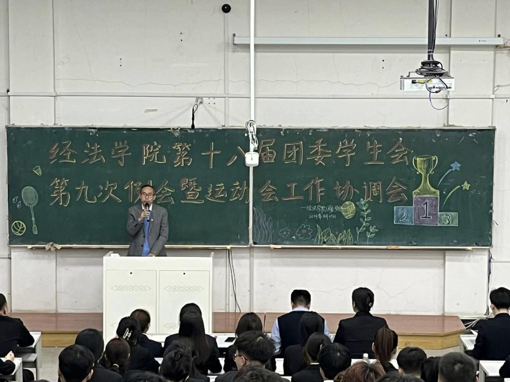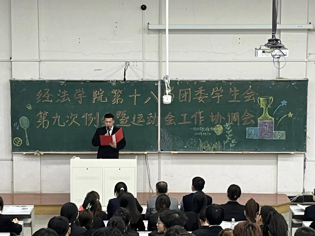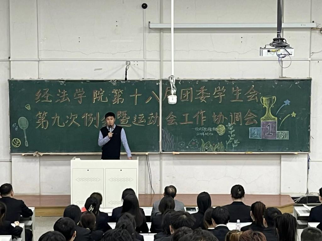 4月23日,经法学院于博学楼C302召开第十八届团委、学生会第九次例会暨运动会工作协调会。本次会议由学院团委副书记张鹏飞主持,学院党委副书记张国华出席会议、全体团学骨干以及运动员共计160余人参加会议。