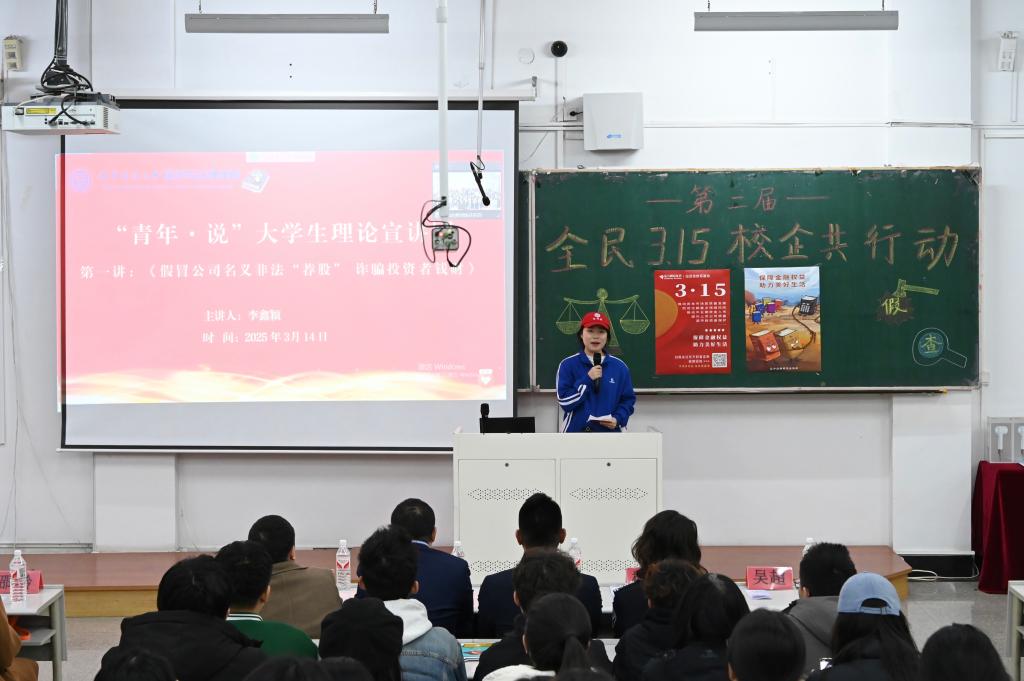 宣讲会上,李鑫颖以“警惕非法荐股,守护财产安全”为主题,通过剖析非法荐股的经典案例、介绍非法荐股涉及的法律知识,提醒同学们投资需警惕“稳赚不赔”“内幕消息”等话术,务必通过中国证监会、证券业协会官网核查机构资质,选择合法投资渠道,切勿向个人账户转账,筑牢金融安全防线。