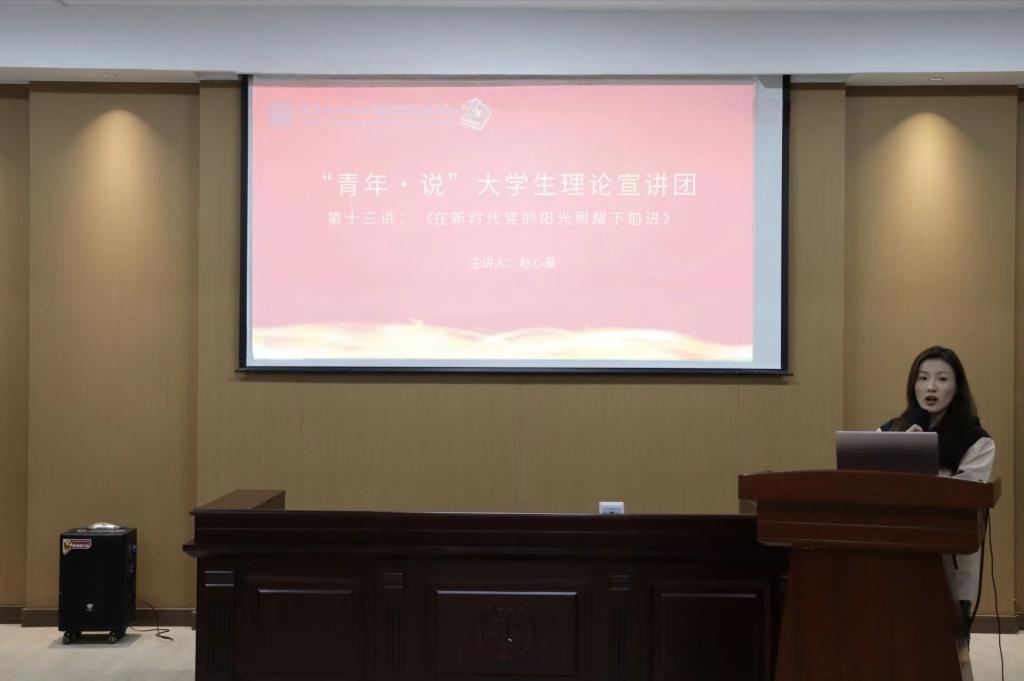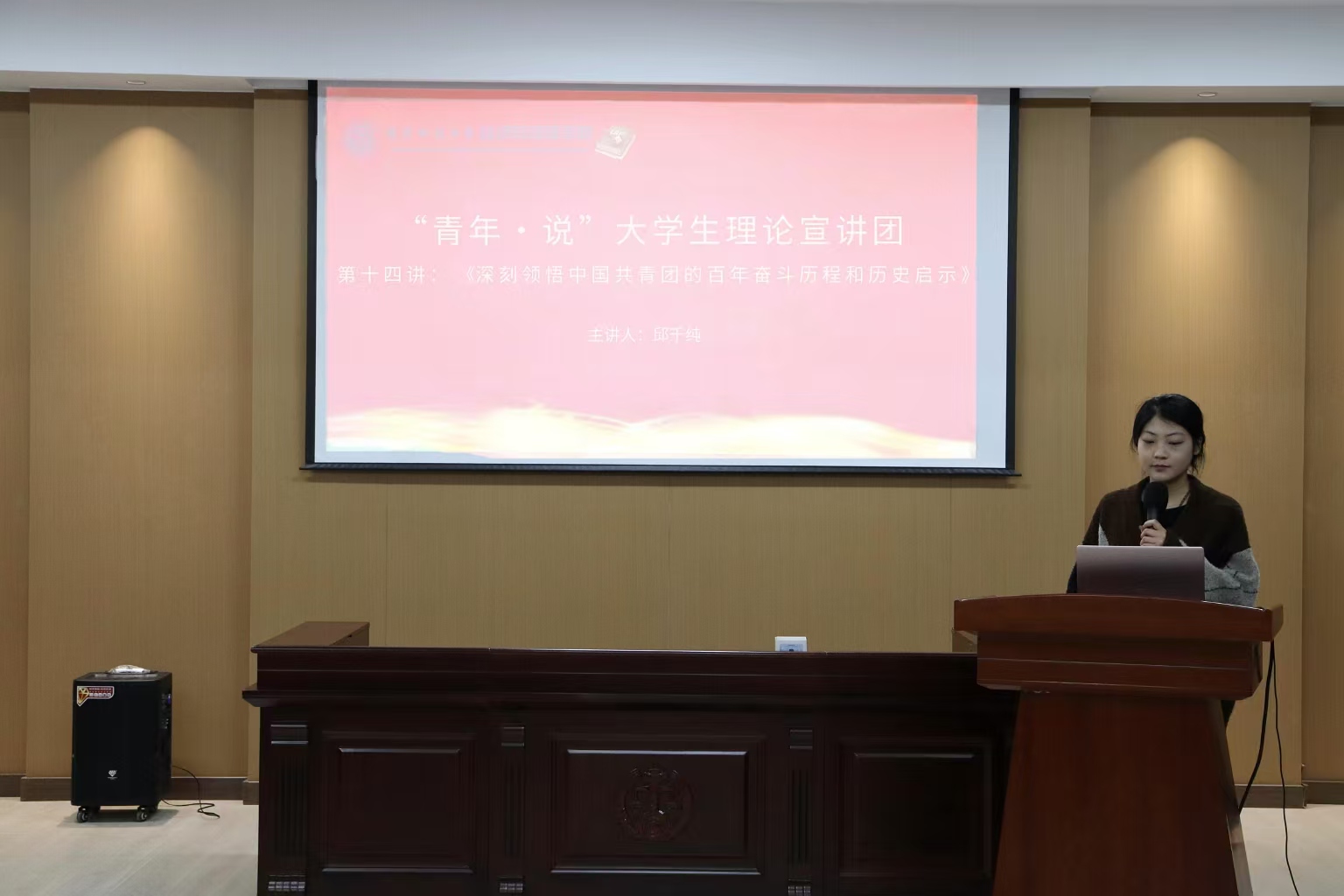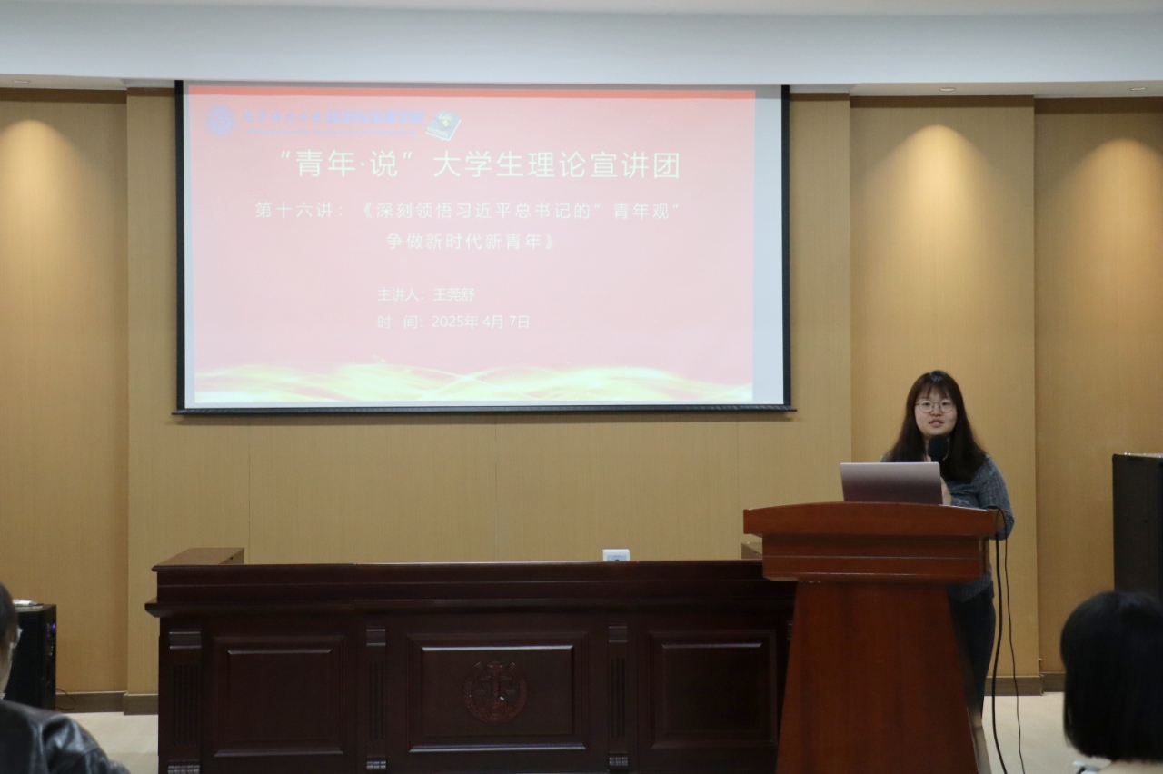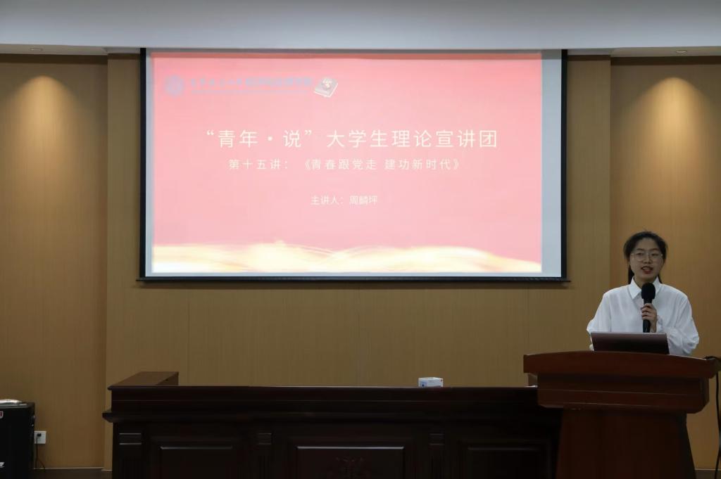 学院“青年·说”大学生理论宣讲团成员周麟坪和王莞舒分别作“青春跟党走,建功新时代”“深刻领悟习近平总书记的‘青年观’,争做新时代新青年”主题宣讲,强调时代的责任赋予青年,时代的光荣属于青年,作为新时代新青年,应敢于吃苦耐劳、敢于挺膺担当,在实际行动中展现青春作为、彰显青春风采、贡献青春力量。
