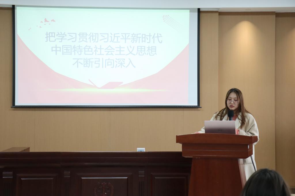 学院组织员王艺霏作“把学习贯彻习近平新时代中国特色社会主义思想不断引向深入”主题宣讲。她从世情、国情及党情三个方面向同学们介绍了开展此次主题教育的时代背景,强调“要全面把握习近平新时代中国特色社会主义思想的科学体系”这一关键观点,引导学生深入学习贯彻习近平新时代中国特色社会主义思想并加以运用,为推动党建事业的发展贡献力量。