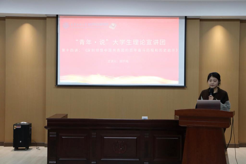 宣讲会上,邱千纯以“深刻领悟中国共青团的百年奋斗历程和历史启示”为主题,带领同学们回溯百年团史。她强调,共青团始终与党同心、听党话、跟党奋斗,在百年征程中紧密跟随党的步伐,在不同历史阶段都发挥着重要作用。她向青年学子发出倡议,主动将个人理想融入国家发展大局,为实现共同富裕的宏伟目标添砖加瓦,书写无愧于时代的青春答卷。