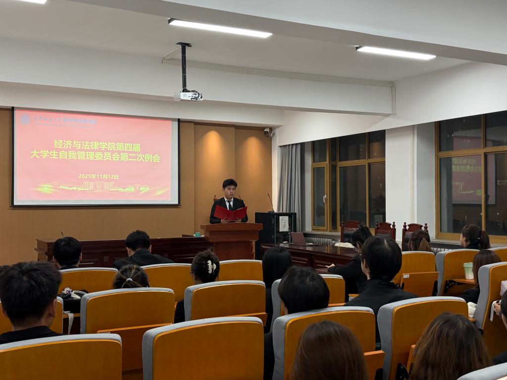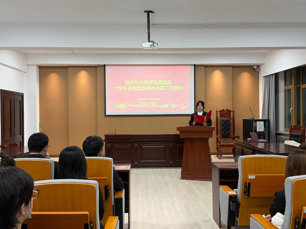 11月12日,经法学院于博识楼A402召开第四届大学生自我管理委员会(以下简称自管会)第二次例会,会议由经法学院自管会执行主席刘鑫喆主持,第四届自管会全体成员参加了本次会议。