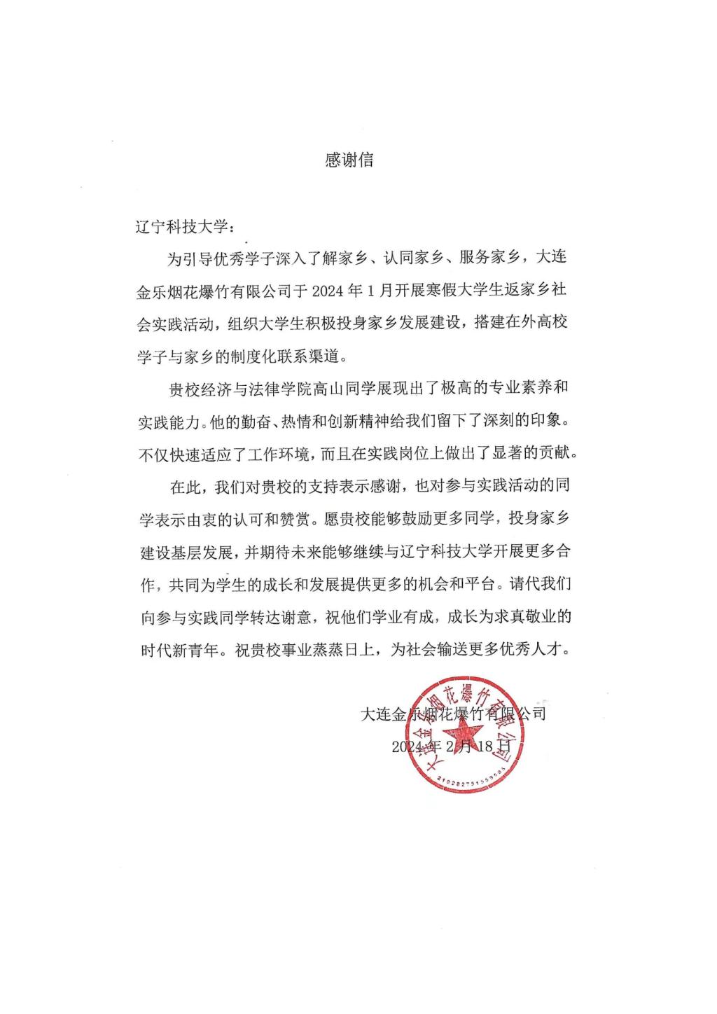 高山,男,共青团员,现任金融22-2班宣传委员、金融23-2班班导生、院学生会办公室工作人员。2024年寒假期间,该生投身实践,深入基层,在大连金乐烟花爆竹有限公司销售部门实践实习期间,主要负责品宣、销售以及库存整理清点工作。