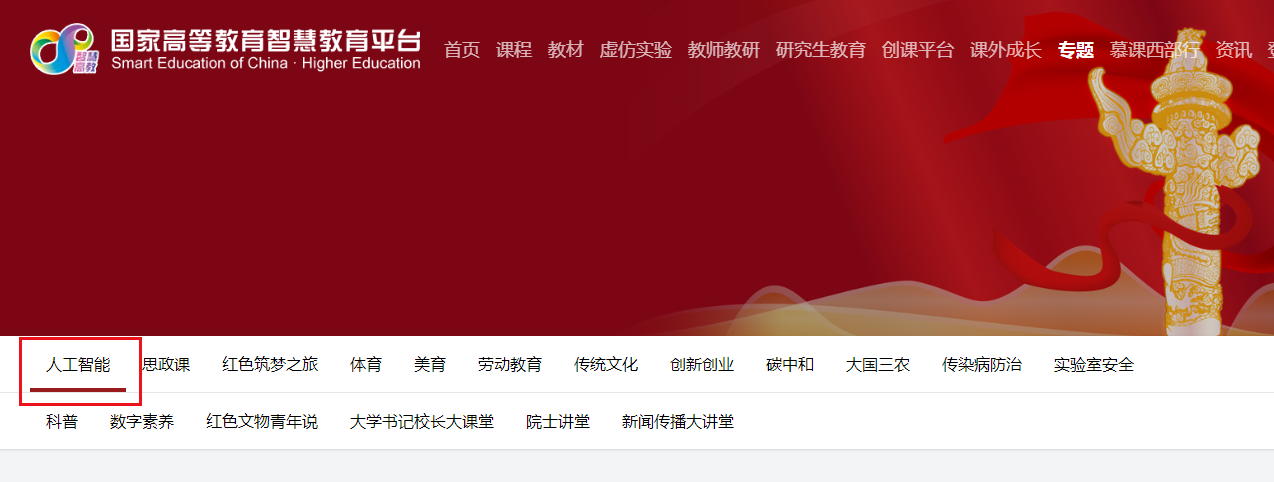 第一步,登录国家高等教育智慧教育平台,并点击“专题”,地址为:https://higher.smartedu.cn///higher.smartedu.cn/,或通过学校教务处主页跳转链接。