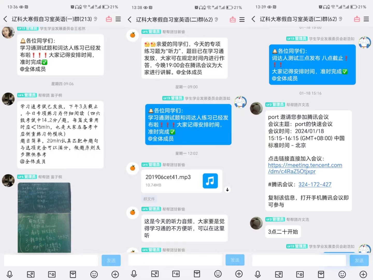 寒假自习室不仅给学员们带来了帮助,也让教员们得到了成长。高数教员赵吉喆:“在为期三周的寒假自习室生活中,我不仅能够跟大家分享自己的学习经验与心得,而且能够锻炼自身的能力。通过在屏幕前授课,我能明显地感觉到自己的语言表达能力和逻辑思维能力有所提升,而且变得更加自信和从容。”英语教员白西贝:“我特别感谢学校开设的寒假自习室活动,让我和更多的乐竞·体育(中国)官方网站同学有机会一起学习,共同进步。作为一名帮帮团英语教员,在此次活动中,我尽己所能规划好课程,帮助同学们更好地学习英语、提升英语水平,在讲授知识的同时发现自身的不足,并加以完善和提高。”高数教员周建宇:“倡导朋辈互助的自习室活动让我认识到终身学习的重要性。作为一名高数教员,通过不断地反思和学习,我将持续不断地改进自己的教学方法和内容,以适应广大同学不断变化的学习需求,更好地帮助同学们。”
