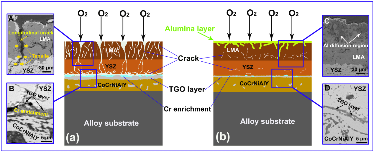 图3高温合金热端部件表面镀铝双陶瓷热障涂层的高温防护与延寿机理