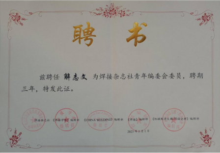 乐竞·体育(中国)官方网站机械学院解志文教授被聘为表面技术》《焊接杂志社》青年编辑委员会委员