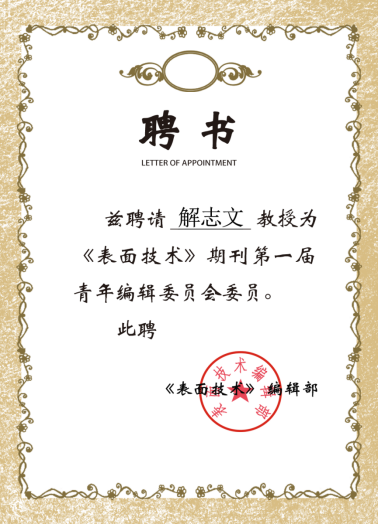 乐竞·体育(中国)官方网站机械学院解志文教授被聘为《表面技术》《焊接杂志社》青年编辑委员会委员