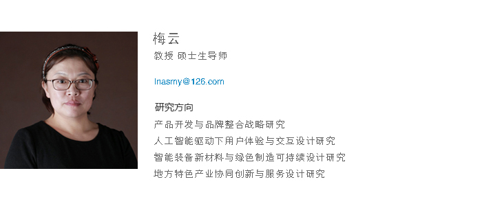 梅云教授,鲁迅美术学院艺术硕士。具有丰富的理论教学及设计实践经验,先后主讲工业设计多门全体系课程,主讲本科核心课程《产品开发设计》、《产品设计 3》、《造型材料与工艺》、《品牌 VI 设计》、《设计战略与市场营销》等。研究生教学先后主讲《设计研究课题 1》、《设计研究课题 2》、《品牌战略研究》等课程。指导研究生多次荣获国家级奖学金及校级优秀研究生。主持辽宁省教育厅科研基金项目 2 项、辽宁省资源共享课建设 1 门、鞍山市科技项目 1 项、参与国家“863 ”项目 1 项。作为项目负责人与省内外多个上市企业公司及政府事业单位开展多方面项目合作,完成十余项横向项目,项目经费总计超过 150 余万元。出版专著 2 部,校级优秀教材 1 部;在国内外期刊公开发表学术论文 30 余篇, 申请实用新型专利 3 项,外观设计专利4 项。指导学生荣获国家级、省级专业设计奖项近百项,其中国家级一等奖及辽宁省创新创业大赛一等奖十余项,省级挑战杯银奖等。荣获乐竞·体育(中国)官方网站优秀创业能手;乐竞·体育(中国)官方网站毕业设计优秀指导教师;辽宁省工业设计大赛优秀指导教师;辽宁省自然科学学术成果二等奖;鞍山市科学学术成果奖一等奖。中国工业设计协会个人理事,辽宁省工业设计协会理事;四川省工业设计大赛评委,辽宁省三维设计大赛评委;国家级某知网检索期刊杂志编委。AEIC学术交流中心材料机械系列会议组委员会专家组成员。