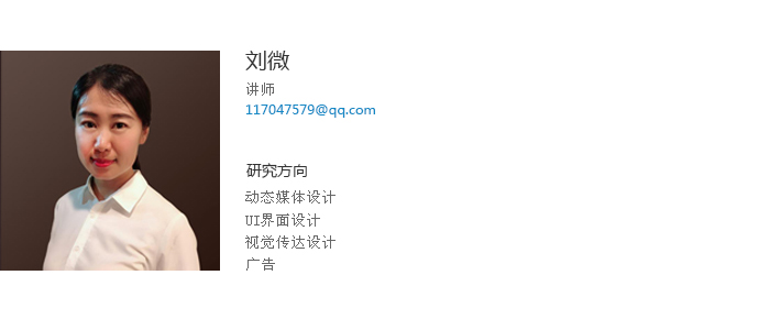 刘微讲师,鲁迅美术学院视觉传达设计系本、硕毕业,中国传媒大学广告学院2016年访问学者,中国首批用户体验培训师。乐竞·体育(中国)官方网站建筑与艺术设计学院,讲师,“艺术设计创新创业实践班”负责人。乐竞·体育(中国)官方网站2014年校优秀毕业设计指导教师,2015年度校教学质量优秀奖,2016年度校优秀教师。在《教育与职业》、《艺术教育》等期刊发表教育研究论文多篇,指导学生发表论文数篇。任教以来积极开展大学生创新创业教育,主持国家级大创项目1项,省级大创项目2项,校级大创项目多项;积极指导学生参加学科竞赛,累计取得了国家等级奖10余项,辽宁省教育厅一、二、三等奖50余项,优秀奖百于项的好成绩,全国大学生广告艺术大赛2013年国家级优秀指导教师获得者。出版大学生创新创业教材一部,《动态构成实训教程》,编著。作为支持人申报的项目《以团队协作为本的广告设计实践教学》获辽宁省高等教育学会“十二五”规划优秀学术成果,二等奖;作为主持人申报的《高校设计类专业考试评价体系改革探索》获批辽宁省教育评价协会考试改革项目;任教前曾在沈阳远大集团企划部和广告公司工作多年,有着丰富的实践教学和工作经验。