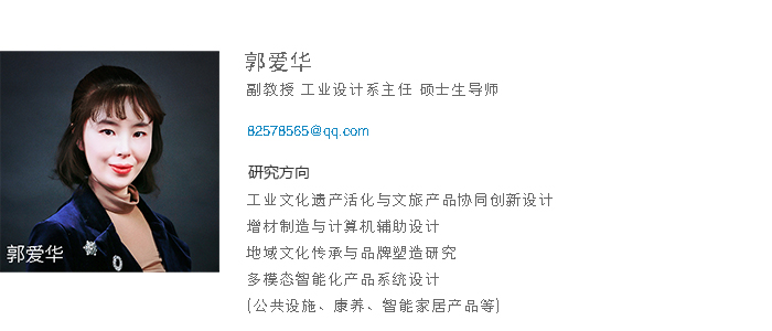 郭爱华,韩国庆一大学设计学博士,北京理工大学设计艺术学硕士(本硕博均工业设计专业)。曾获乐竞·体育(中国)官方网站校级教学质量优秀奖两次;主持校级教改项目及教育科学研究课题共计十余项、省级教改项目主要完成人、主持及参与省校级教改成果奖一二三等奖共计十余项;曾获全国高校教师(本科)微课教学大赛辽宁省一等奖、全国多媒体课件大赛二等奖三等奖各一项、辽宁省教育软件大赛三等奖两项、校多媒体课件教学大赛一等奖、校优秀教案大赛一等奖二等奖;主编出版高等院校工业设计类“十二五”规划教材一部;主持中国科协青年智库成果、辽宁省社科联资助项目、辽宁省教育厅项目、鞍山市社科联项目等十余项;参与辽宁省自然科学基金项目、省精品资源共享课建设、省教育厅项目、市级科学计划项目等十余项;发表检索、核心论文多篇、教学研究论文多篇;授权实用新型专利和外观设计专利十余项;指导国家级省级大创项目若干、获校级大创年会一等奖两次二等奖一次;指导学生在A类学科竞赛中获一二三等奖若干、获辽宁省大学生工业设计大赛优秀指导教师。