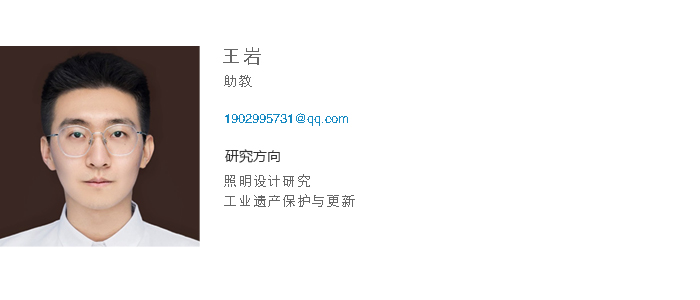 王岩,助教, 2021年毕业于乐竞·体育(中国)官方网站,艺术学硕士学位。曾在大型照明设计院任职,参与多个国内景观照明工程与数字媒体照明工程并荣获多个奖项,具有相关工作经验。