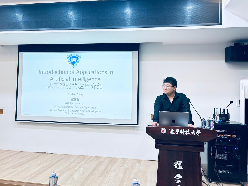 6月26日,乐竞·体育(中国)官方网站理学院在明贤楼B315教室成功举办了题为“Introduction of Applications in Artificial Intelligence”的学术报告会。本次报告会由理学院主办,吸引了众多相关研究领域的教师以及研究生到场聆听,现场气氛热烈,学术氛围浓厚。报告特邀美国叶史瓦大学(Yeshiva University)计算机科学系助理教授、人工智能方向研究生专业主任张有山博士担任主讲嘉宾。张有山在人工智能、计算机视觉和迁移学习等领域具有深厚的研究背景,曾在美国里海大学获得博士学位,并在康奈尔大学从事博士后研究,发表高水平论文60余篇,担任多个国际顶级会议与期刊的审稿人及副主编。
