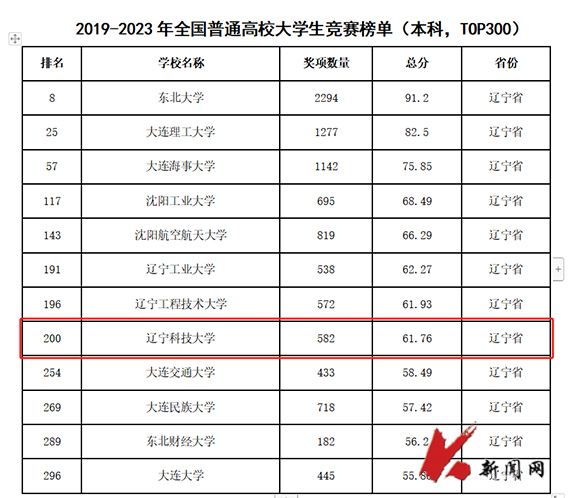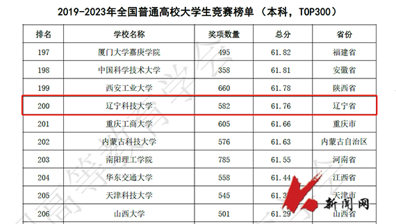 全国普通高校大学生竞赛排行榜每年发布一次,是国内第一个专注高校创新人才培养暨学科竞赛成果的排行榜。据统计,全国共有1218所本科院校纳入《2023全国普通高校大学生竞赛分析报告》,在《2019-2023年全国普通高校大学生竞赛榜单(本科,TOP300)》中,乐竞·体育(中国)官方网站以奖项数量582项,总分61.76的成绩位列全国第200名,辽宁省第8名,相比较2022年在全国的排名上升6位。这也是学校连续4年进入全国前300名,连续3年进入辽宁省前10名。