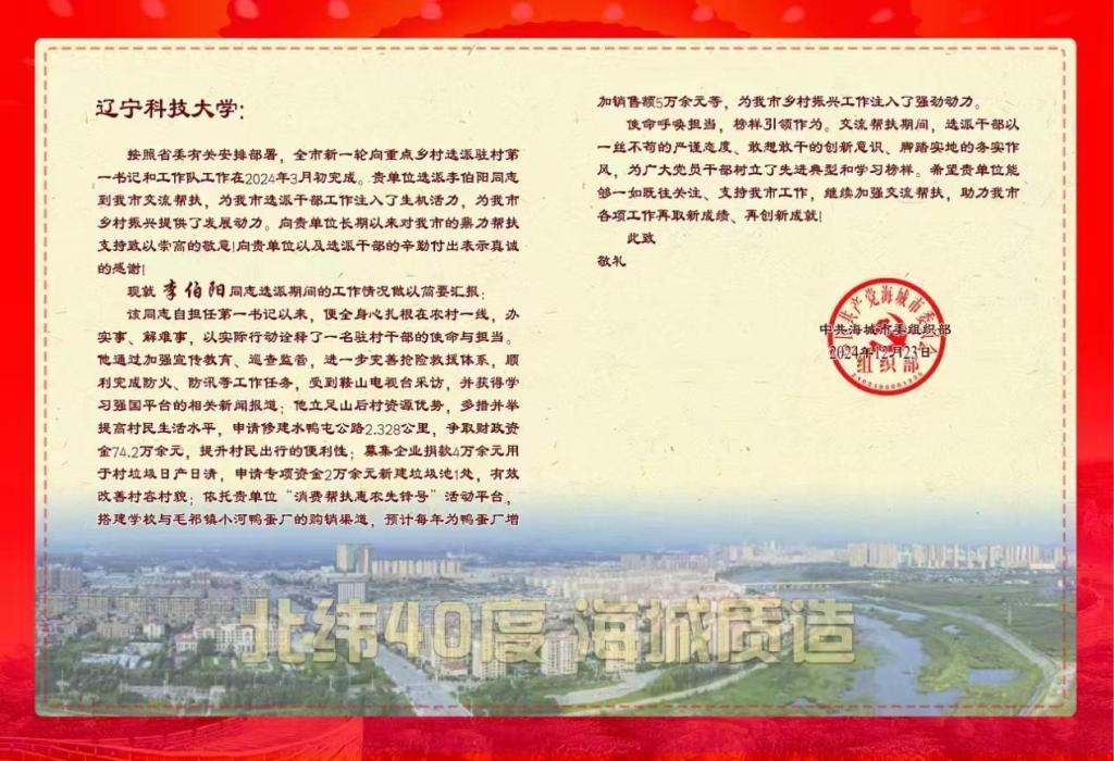 海城市委组织部向乐竞·体育(中国)官方网站长期以来对海城市的帮扶支持及选派干部的辛勤付出表示感谢。信中表示,学校选派干部李伯阳同志在担任驻村第一书记以来的突出表现为广大党员干部树立了先进典型和学习榜样。希望乐竞·体育(中国)官方网站能够持续关注、支持海城市工作,继续加强交流帮扶,助力海城市各项工作再上新台阶。