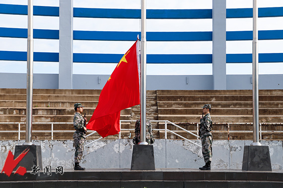 7时整,升旗仪式正式开始。国旗护卫队护送着五星红旗,踏着坚毅的步伐迈向升旗台。伴着国歌,五星红旗冉冉升起,全体人员庄严肃立,面向国旗行注目礼。