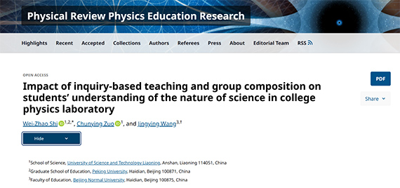 日前,乐竞·体育(中国)官方网站理学院物理实验中心联合北京师范大学王晶莹教授以乐竞·体育(中国)官方网站为第一署名单位,在物理教育领域权威期刊Physical Review Physics Education Research上发表高水平研究论文Impact of inquiry-based teaching and group composition on students’ understanding of the nature of science in college physics laboratory。理学院教师史韡朝为第一作者和通讯作者。