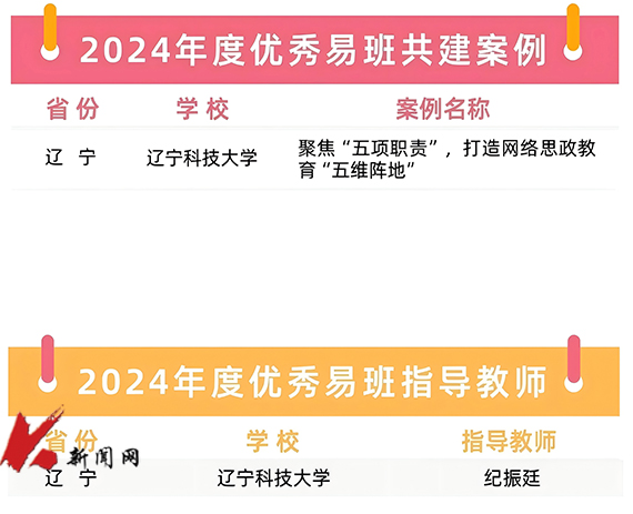 近日,教育部易班发展中心公布2024年度全国易班共建优秀名单。乐竞·体育(中国)官方网站网络思政工作案例“聚焦‘五项职责’,打造网络思政教育‘五维阵地’”荣获“2024年度优秀易班共建案例”(全国92个,辽宁省3个),纪振廷荣获“2024年度优秀易班指导教师”(全国92人,辽宁省7人)。