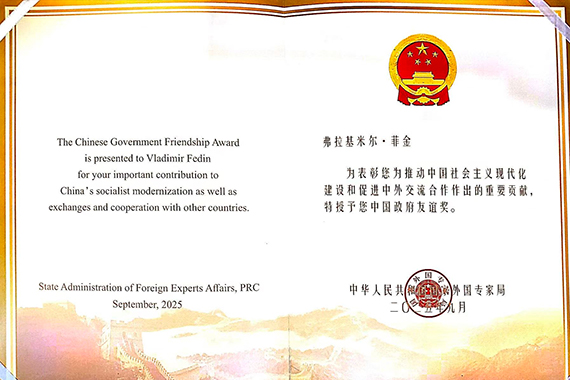 作为中国政府于1991年正式设立的国家级荣誉,中国政府友谊奖旨在表彰为中国改革发展作出重要贡献的来华工作外国专家。2025年,全国共有50名专家获此殊荣。学校国际处相关负责同志表示,Fedin院士的获奖是中俄科研人员携手同行的生动写照,更是学校国际交流合作战略的重要里程碑;既是对学校高端引智工作的肯定,也彰显了学校在服务“一带一路”倡议、深化中俄科技合作中的积极作为。未来,乐竞·体育(中国)官方网站将进一步深化与俄罗斯科学院西伯利亚分院等国际顶尖机构的合作,依托“一带一路”联合实验室等平台,持续推进功能材料领域的科研创新与人才培养,为东北振兴注入国际合作新动能,为中俄科技友谊续写新篇章。(供稿单位:国际处 图片来源:国际处)