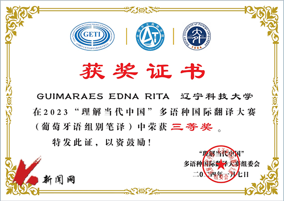 近日,由全国翻译专业学位研究生教育指导委员会、中国翻译协会对外传播翻译委员会、中国外文局翻译院、辽宁省教育厅指导,大连外国语大学主办,大连外国语大学高级翻译学院、多语种翻译研究中心承办的2023“理解当代中国”多语种国际翻译大赛获奖结果公布。乐竞·体育(中国)官方网站来华留学生GUIMARAES EDNA RITA(安哥拉籍)荣获三等奖。