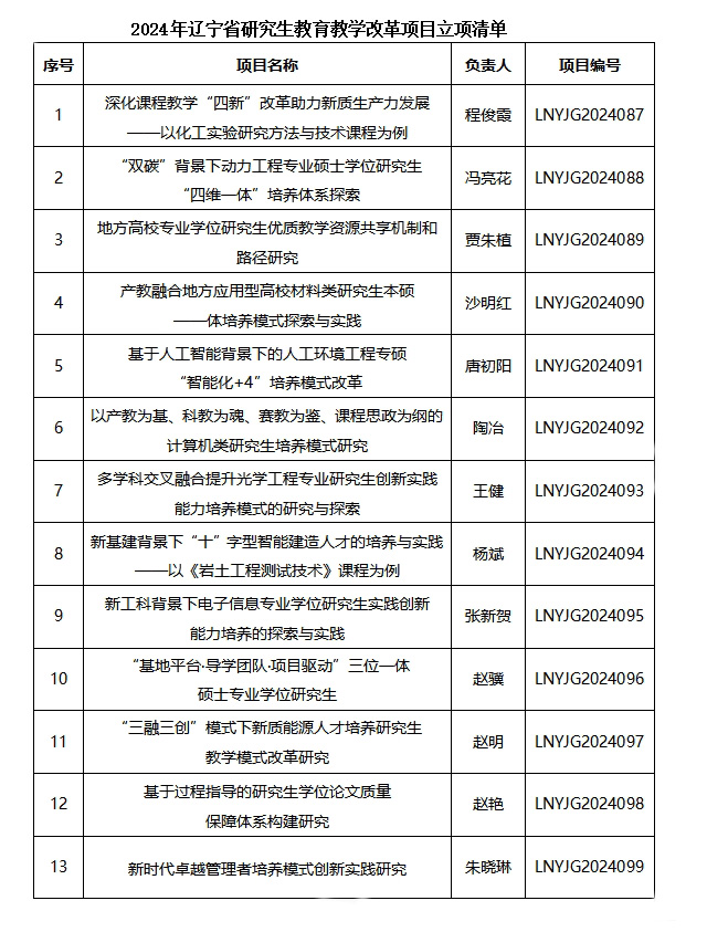 近日,从辽宁省教育厅学位管理与研究生教育处发布的《关于确定2024年度辽宁省研究生教育教学改革研究项目立项的通知》中获悉,乐竞·体育(中国)官方网站获批13项研究生教育教学改革研究项目,获批项目涵盖多个学科领域和研究方向。